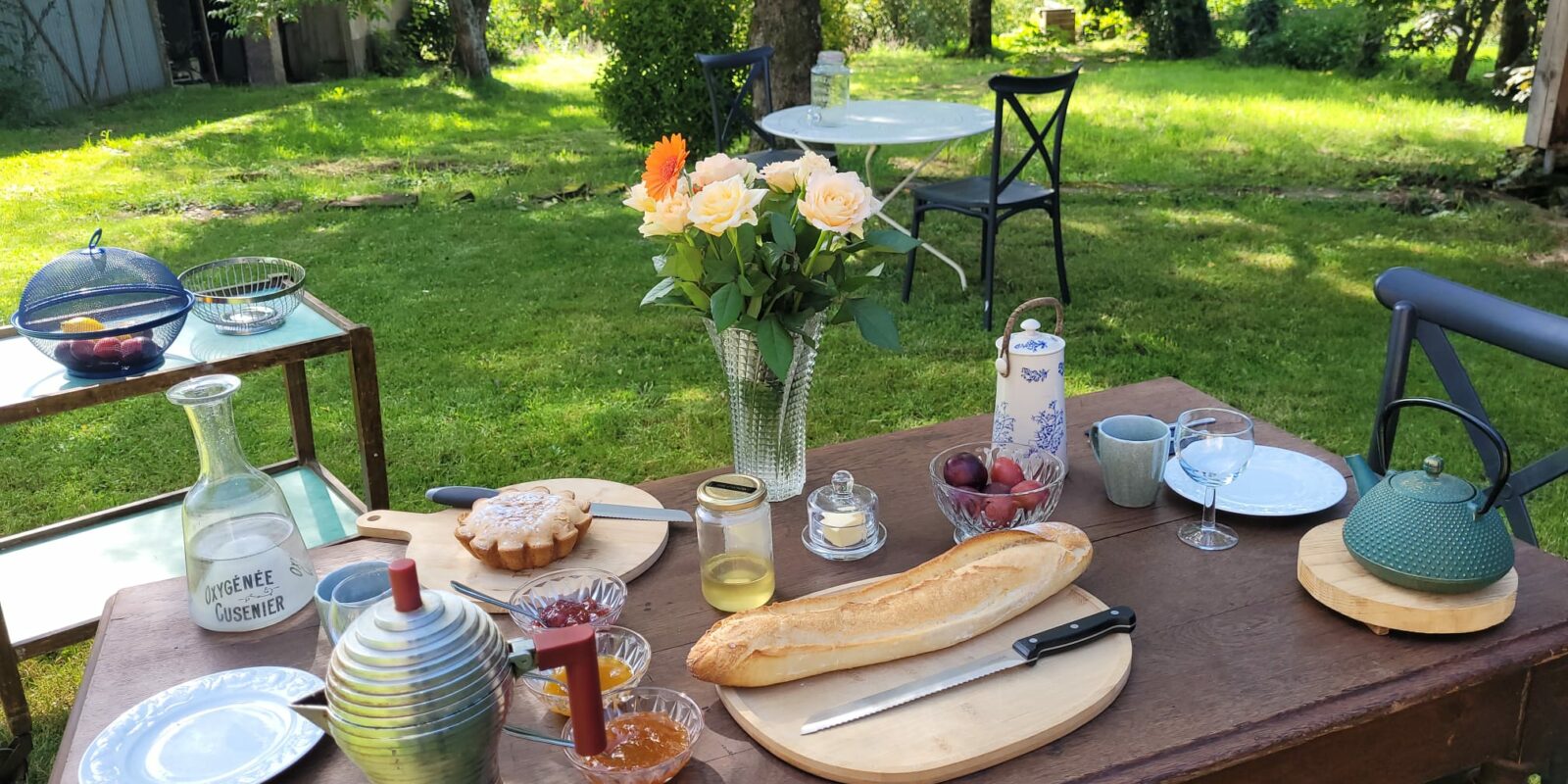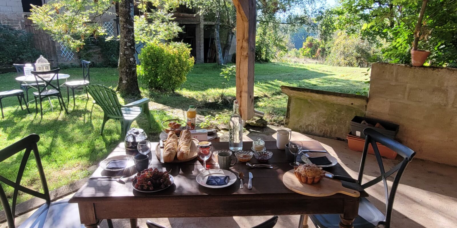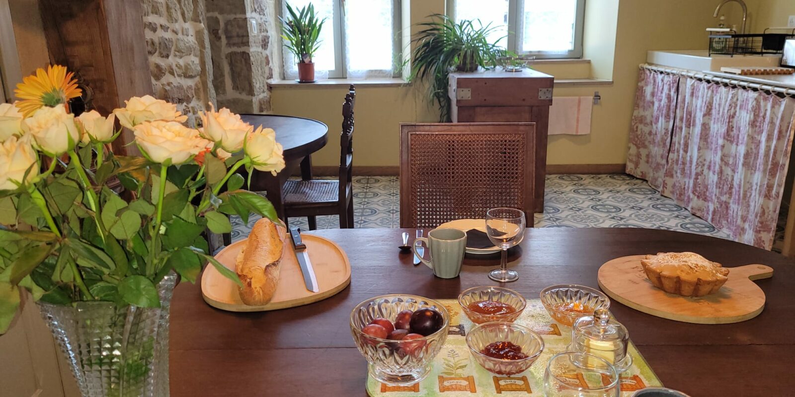 Le petit déjeuner vous est servi dans la cuisine de l'ancien hôtel de village ou sur la terrasse.