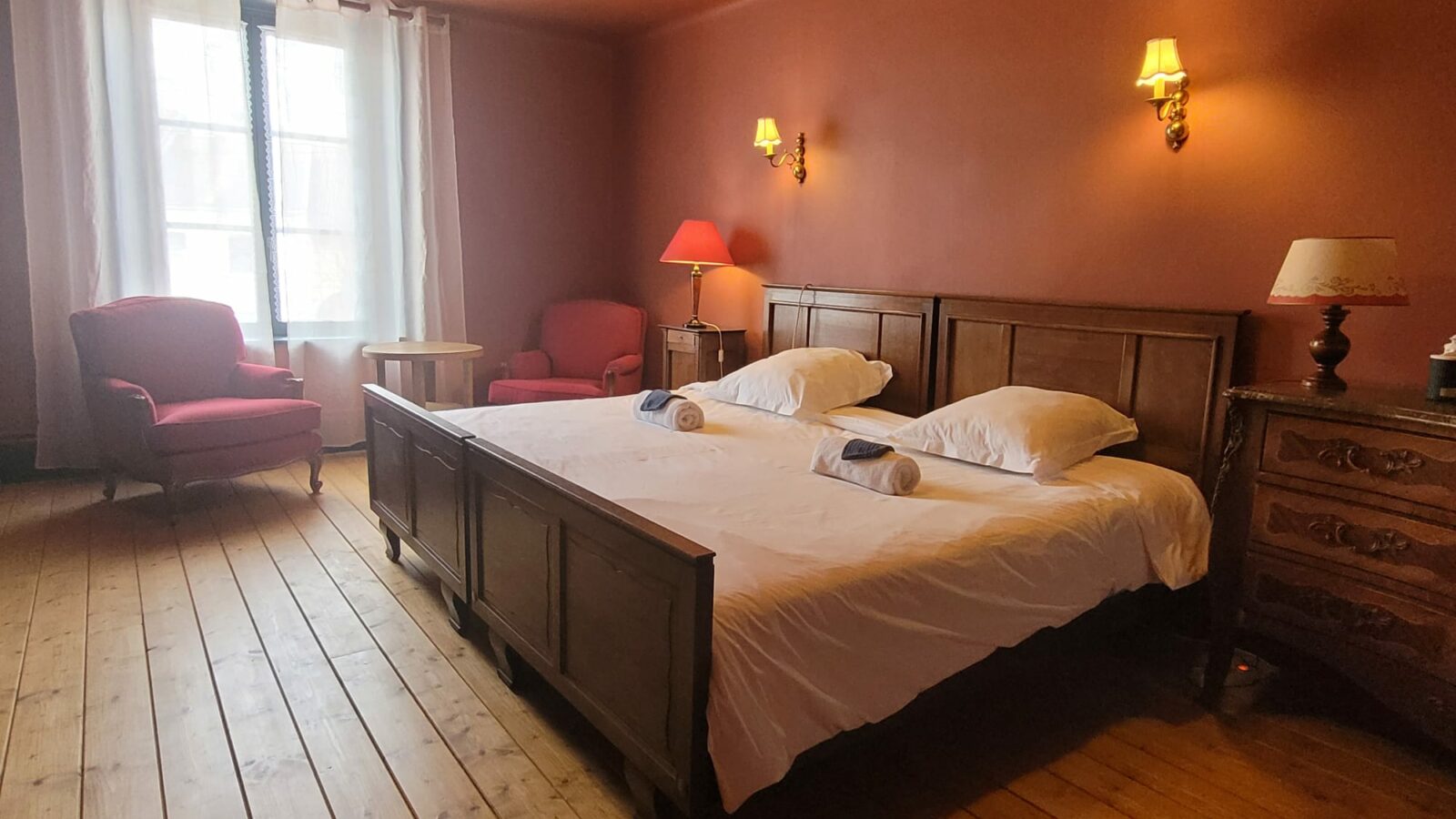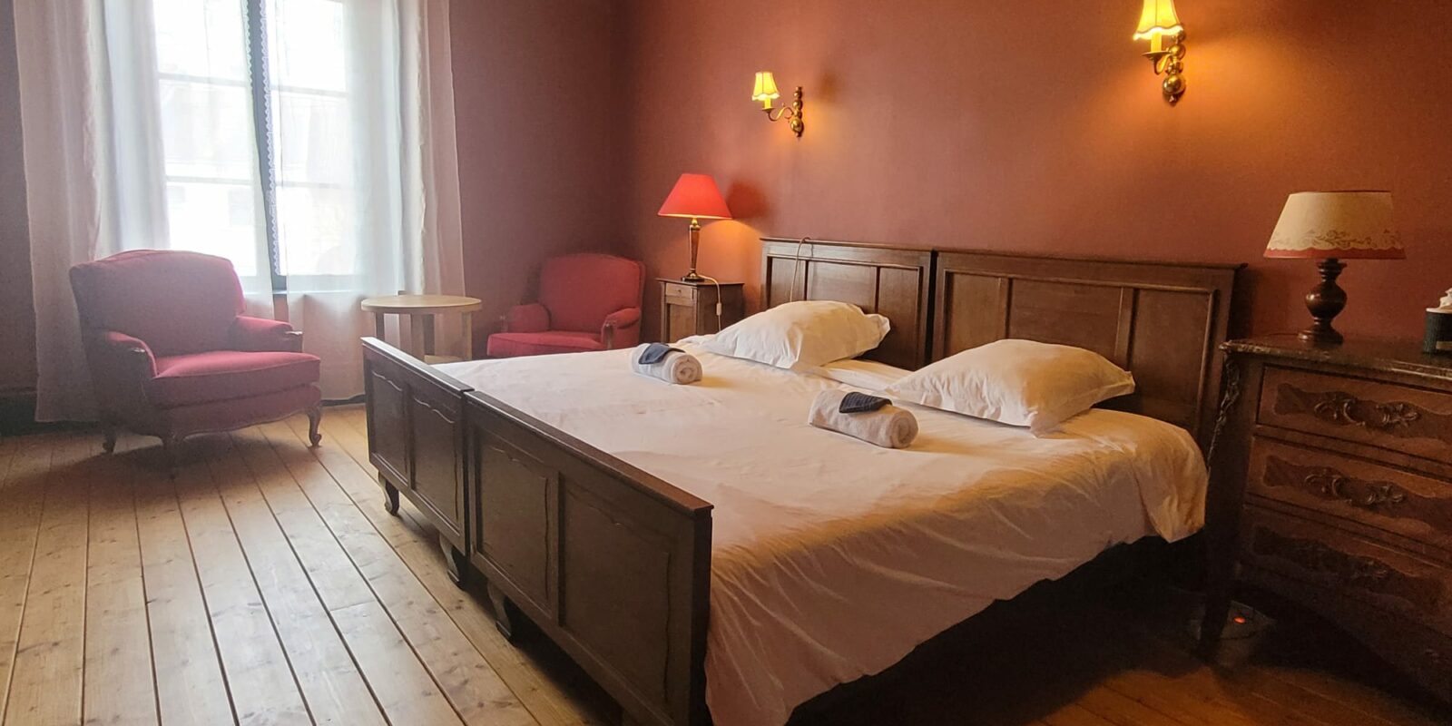 La Chambre Théophile est notre suite la plus grande (38 m2), avec une salle de bain lumineuse et des toilettes séparées.