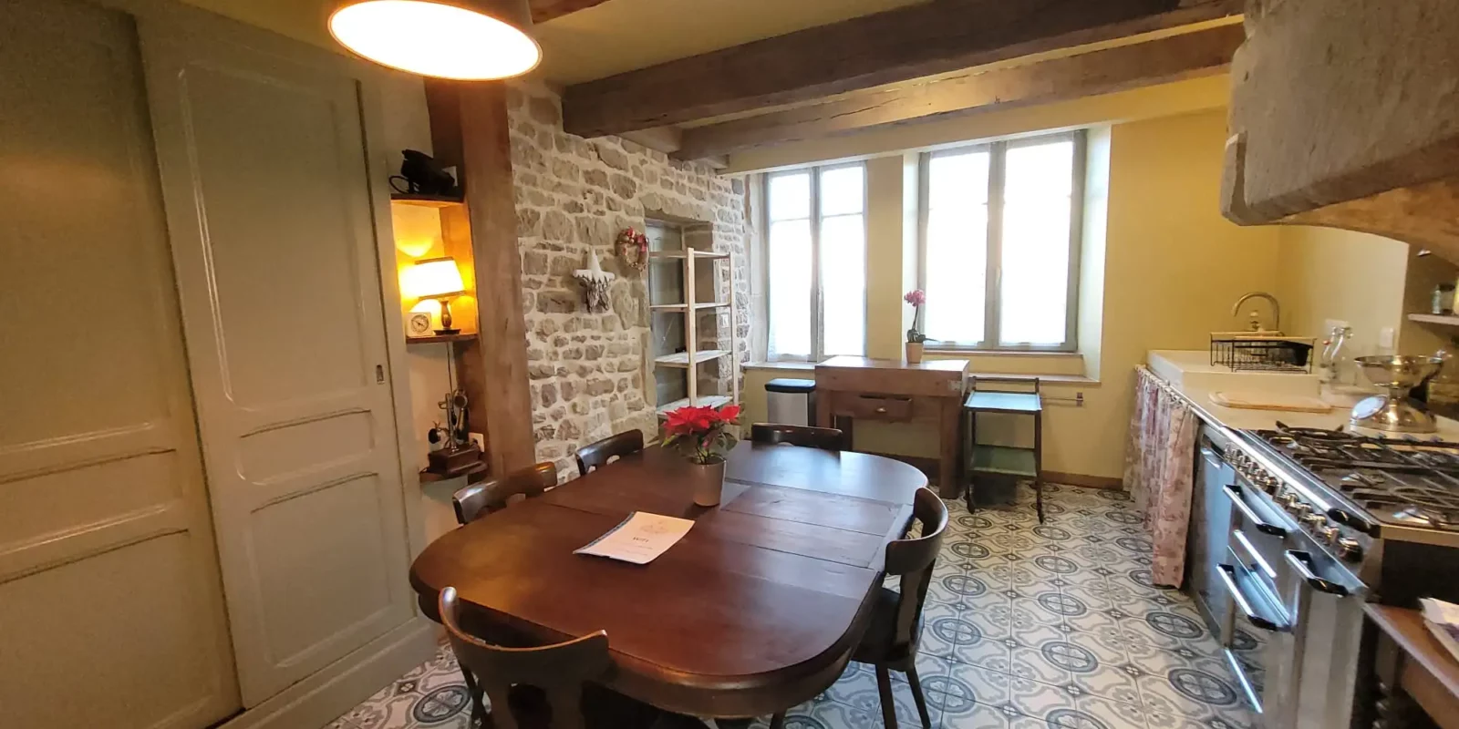 Le petit déjeuner vous est servi dans la cuisine de l'ancien hôtel de village ou sur la terrasse.